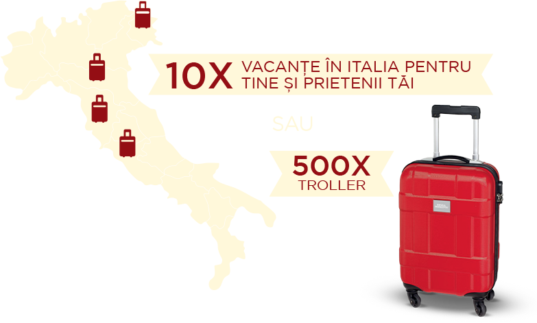 Promoția se desfășoară în perioada 01 septembrie – 31 octombrie 2022, în locațiile participante semnalate. La promoție participă toate produsele Birra Moretti comercializate în locații. Premiile oferite în promoție sunt: 500 x troller și 10 x vacanțe în Italia, oferite prin tragere la sorți. Vacanța se acordă sub formă de voucher la Happy Tour folosit pentru cazare, transport și transfer, în valoare de 12.500 de RON. Valoarea comercială totală a premiilor este de 244.325 de RON (TVA Inclus). Pentru mai multe detalii, consultă Regulamentul disponibil gratuit pe www.birramoretti.com/ro/ro sau la Infoline 0215280677.